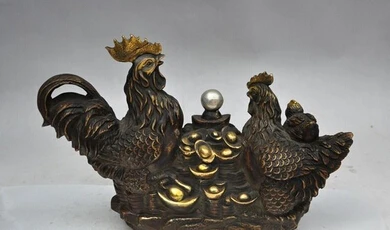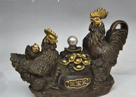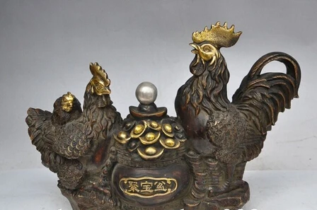 HOT SALE 007891 13"Chinese Bronze gilt wealth Treasure bowl Cock Rooster Chicken family statue